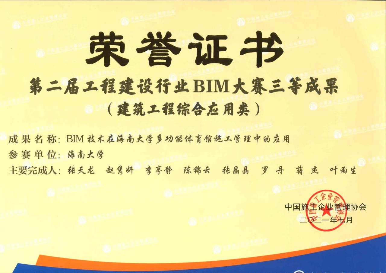 本届大赛组委会设在工业和信息化部人才交流中心,组委会秘书处设在石家庄铁道大学,大赛组委会组建专家委员会,中国工程院杜彦良院士担任专家委员会主任,石家庄铁道大学王明生教授担任秘书长。在赛制上,本届大赛坚持校企联合报名的参赛制度,由院校(高职、本科)和企业联合组成团队参赛。其中由张天龙老师指导、伟德BV1946官网BIM协会申报的“伟德BV1946官网多功能综合体育馆BIM技术综合应用经过网上报名、作品提交、初评、答辩评审等环节,最终再次蝉联金奖!截止到目前,本项目已经荣获2021年全国高校BIM毕业设计大赛二等奖、2021年工程建设行业BIM大赛三等奖和2021年“龙图杯”全国BIM(建筑信息模型)大赛优秀奖。