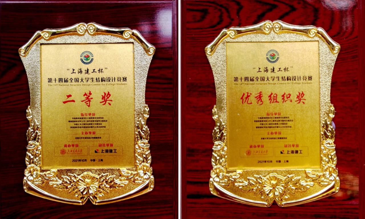 伟德BV1946官网代表队荣获第十四届全国老员工结构设计竞赛二等奖!参赛队员分别为2019级土木工程专业陈其镕、郭子培和丁睿同学,预备队员为李兆庭同学,领队为伟德BV1946官网赵菲老师,指导教师为秦术杰老师、赵菲老师和海南城建业施工图审查有限公司黄利高级工程师。竞赛于2021年10月14日至17日举行,由上海交通大学承办。