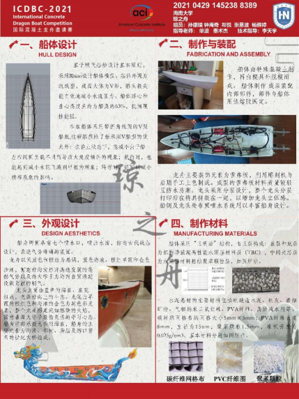 公司参赛作品“琼之舟”,船体主体采用由水泥基、聚苯颗粒、PVC纤维和碳纤维网格布等材料组成的“三明治”结构,船身外形设计寓意融合大海、椰林等海南特色和自贸港建设,并与校训“海纳百川、大道致远”相呼应。比赛当日,公司员工与来自全国各高校的队伍进行了交流,并向专家和评委介绍了参赛作品的基本情况,展示了船身喷水的独特设计,在冲击强度测试单项取得满分,在外观设计和作品展示两项均为第一名,同时进行了激烈的直线竞赛PK赛和障碍赛,最终荣获二等奖和优秀设计奖,充分体现了海大学子的创造能力和精神风貌。