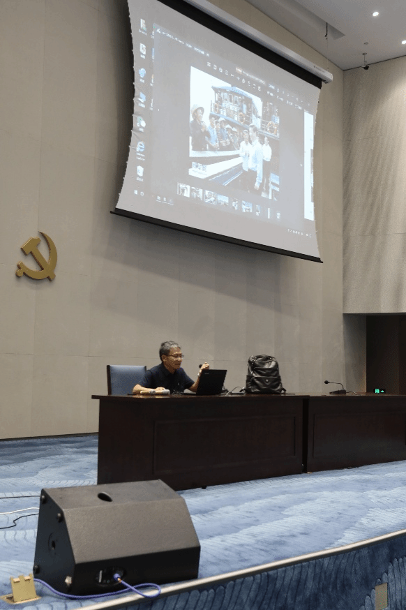 在博物馆报告厅,夏桂平老师以设计图纸与实景照片为引,详解建筑从构思到落成的历程。他以中医问诊作喻,提出认识建筑需 “望” 形态与环境呼应,“闻” 空间韵律,“问” 文化根基,“切” 材料温度。此番妙解,让同学们直观感悟到,渔网穹顶、波浪格栅等设计,正是用现代手法重构传统,使建筑成为文化的生动 “翻译者”。
