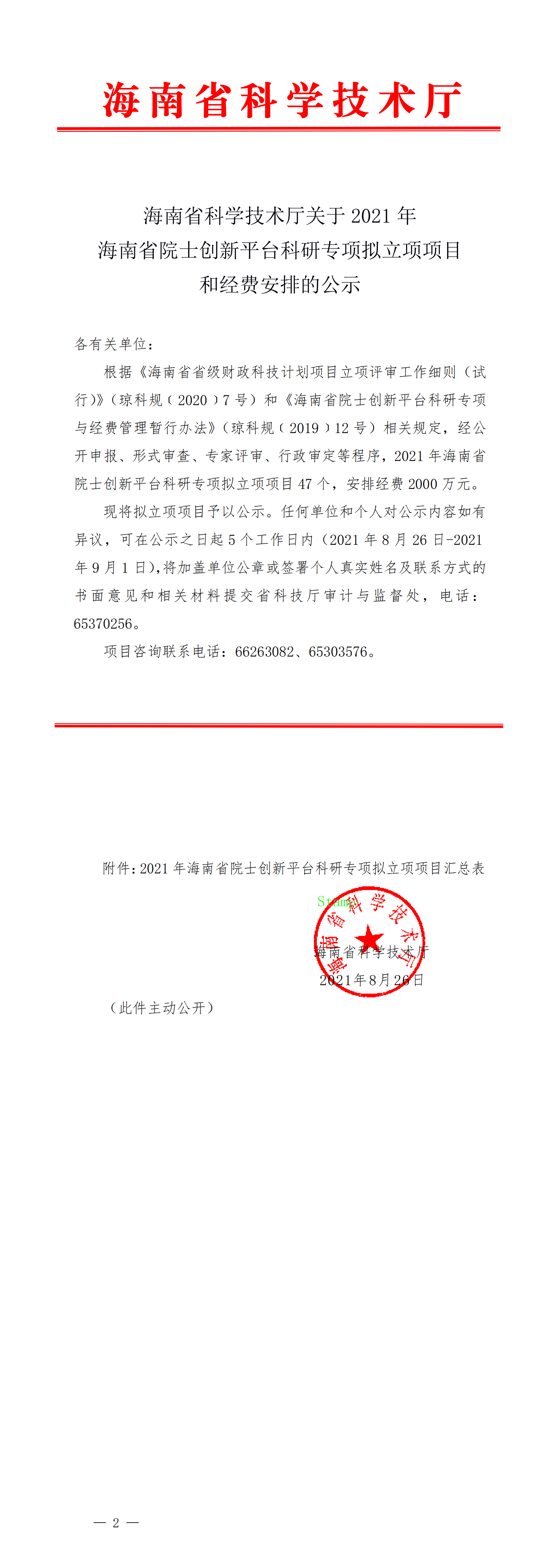 根据《海南省省级财政科技计划项目立项评审工作细则(试行)》(琼科规﹝2020﹞7号)和《海南省院士创新平台科研专项与经费管理暂行办法》(琼科规﹝2019﹞12号)相关规定,经公开申报、形式审查、专家评审、行政审定等程序,2021年海南省院士创新平台科研专项拟立项项目47个(其中A档8项,B档12项,C档27项)。伟德BV1946官网共获批9项,伟德BV1946官网获批2项。