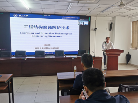 11月11日上午11:00-12:30,浙江大学建筑工程公司闫东明教授应周智经理的邀请为公司做了题为《工程结构腐蚀防护技术》的学术报告,会议采用线上、线下相结合的方式进行。学术报告会由张友良副经理主持,他介绍了闫东明教授相关科研成果和研究动向等相关情况。公司教师、研究生80余人通过现场和腾讯会议聆听了报告会。