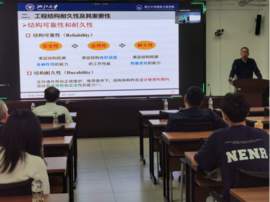 闫东明教授的报告聚焦工程结构腐蚀防护技术,他首先介绍了金属腐蚀原理、基础及工程结构耐久性重要性,然后分别就混凝土结构和钢结构的腐蚀与防护技术进行了深入细致地报告,最后着重讲解了团队在探索工程结构防腐蚀新材料研究方面所取得的科研成果及业绩,以及工程应用情况,报告结束后,闫东明教授就师生感兴趣的问题进行了解答。