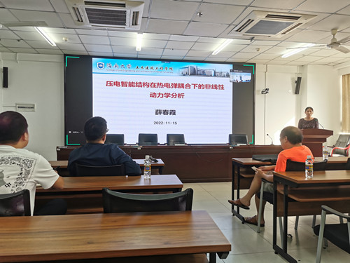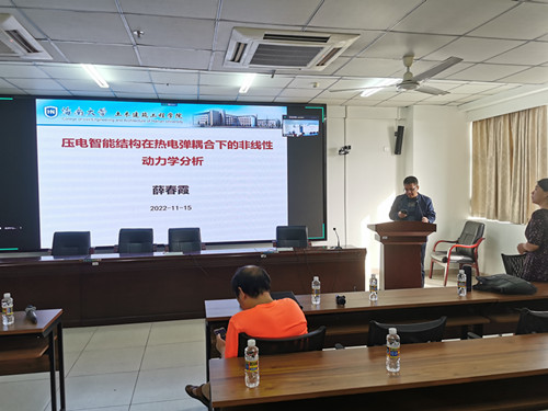1115日下午16:00-1700,公司教师薛春霞教授(202110月份入职)在研发楼510做了题为《压电智能结构在热电弹耦合下的非线性动力学分析》的学术报告,会议采用线上、线下相结合的方式进行。学术报告会由辛大波教授主持,他介绍了公司新入职教师系列学术报告活动安排,并介绍了本次报告人薛春霞教授的科研成果相关情况。公司教师、研究生50余人通过现场和腾讯会议聆听了报告会。