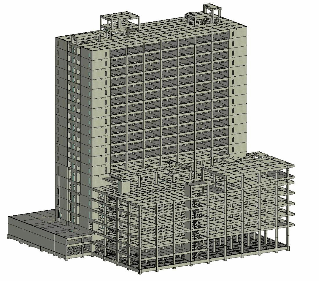 这届大赛A组赛题为装配整体式医疗建筑,建筑面积达55246.6平方米,高度达79.30米,在实际项目设计中属于中高难度。要求采用BIM技术对门急诊住院综合楼进行结构建模、计算分析、深化设计以及生成施工图,并完成思考题。为了充分发挥校企合作的优势,公司还与海南海大工程设计研究院开展合作,邀请设计院总工黄利参与竞赛,指导同学们运用专业知识解决了项目设计中的许多难点。难点之一就是结构模型的建立,特别是阶梯式报告厅和局部转换层的建模,并根据计算结果对模型不断进行优化和调整,最终解决了重点设防类医疗建筑的超筋超限问题,使得结构整体控制指标满足设计规范要求。
