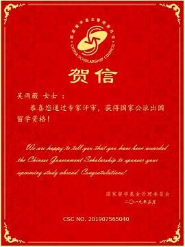 经过国家留学基金委(CSC)评审,2019年度国家公派研究生项目录取结果陆续公布。伟德BV1946官网硕士研究生吴雨薇成功获得国家留学基金委员会资助,将前往日本北海道大学攻读博士研究生学位,这是公司首次获得国家公派博士研究生项目资助,特此祝贺!