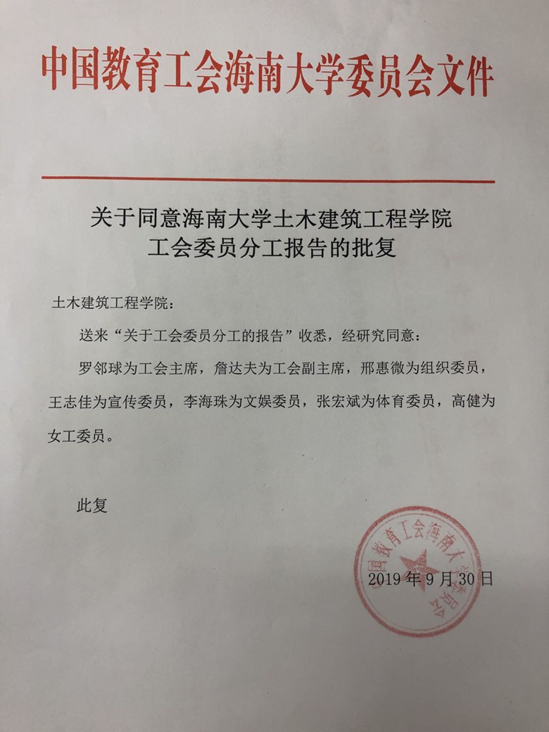 中国教育工会伟德BV1946官网委员会关于伟德BV1946官网工会委员分工的批复