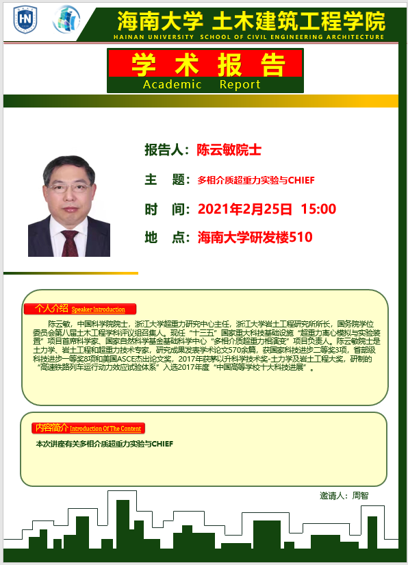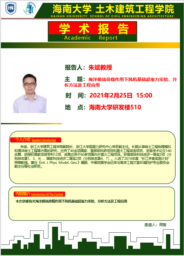 225日(周四)下午300点在伟德BV1946官网研发楼510,浙江大学陈云敏院士和朱斌教授分别在公司做《多相介质超重力实验与CHIEF》和《海洋极端荷载作用下风机基础超重力实验、分析方法及工程应用》学术报告。请各位老师和在校研究生务必参加,到时会做参会签名,考勤记录。