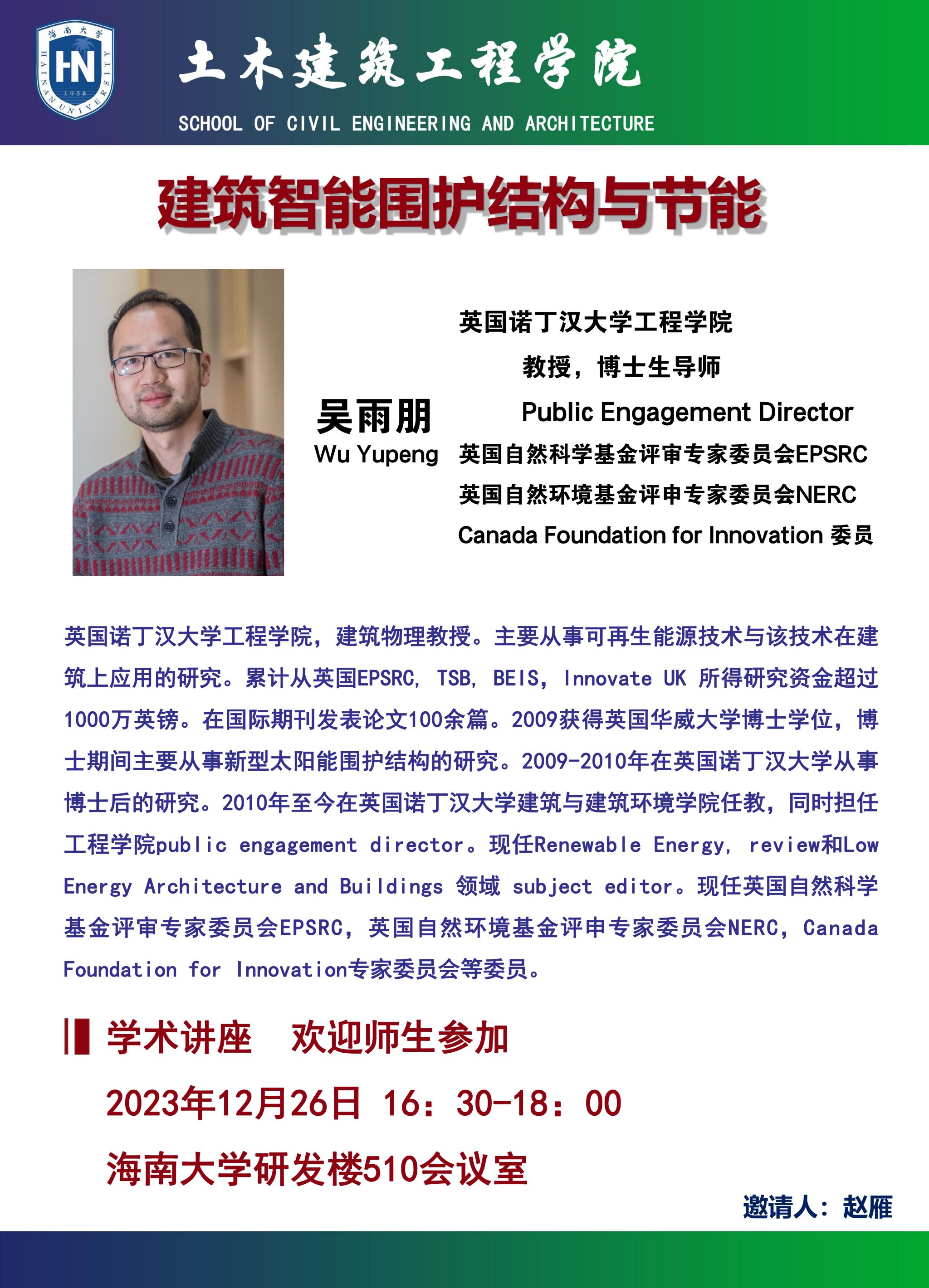 1226日(周二)16:30-1800在伟德BV1946官网研发楼510会议室,英国诺丁汉大学工程公司教授,博士生导师 Public Engagement Director(英国自然科学基金评审专家委员会EPSRC、英国自然环境基金评申专家委员会NERC、Canada Foundation for Innovation 委员),在公司做建筑智能围护结构与节能》学术报告。欢迎有兴趣的师生参加。