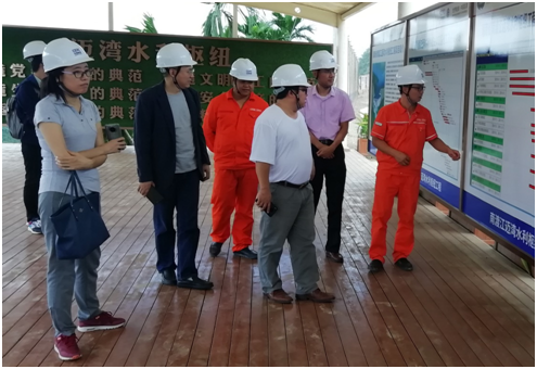 土建公司领导和老师与项目经理熊星,项目总工程师肖伟明等众多技术人员进行了深入交流。在施工现场,萧总工程师对迈湾水利枢纽工程进行了详细介绍。在后续讨论中,技术人员提出了很多工程中存在的难点,例如海南气候变化对施工进程的影响、混凝土施工中的温度控制问题。老师们针对工程中的难点提出了一些解决方案,例如,大体积混凝土施工过程中温度场把控非常重要,尤其是要注重施工过程中的温度差,基于此,采用超算监控温度场,进一步指导混凝土施工,从而保障工程质量。