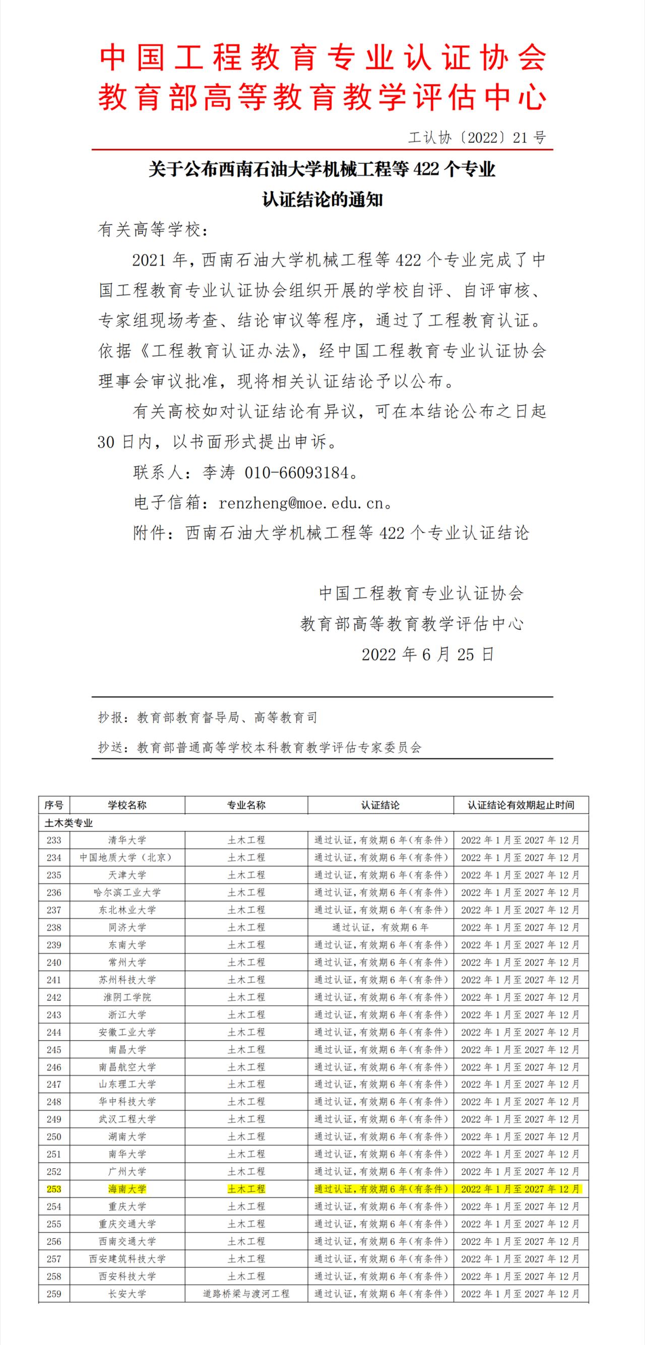 20226月25日,中国工程教育专业认证协会、教育部高等公司产品评估中心发布《关于公布西南石油大学机械工程等422个专业认证结论的通知》(工认协[2022]21号)。伟德BV1946官网土木工程专业顺利通过工程教育认证,认证结论为“通过认证,有效期6年(有条件)”,认证结论有效期起止时间为20221月至202712月。同时通过认证的有清华大学、同济大学和浙江大学等26所高校的土木工程专业。据悉,该名单还将提交至国际工程教育《华盛顿协议》组织。