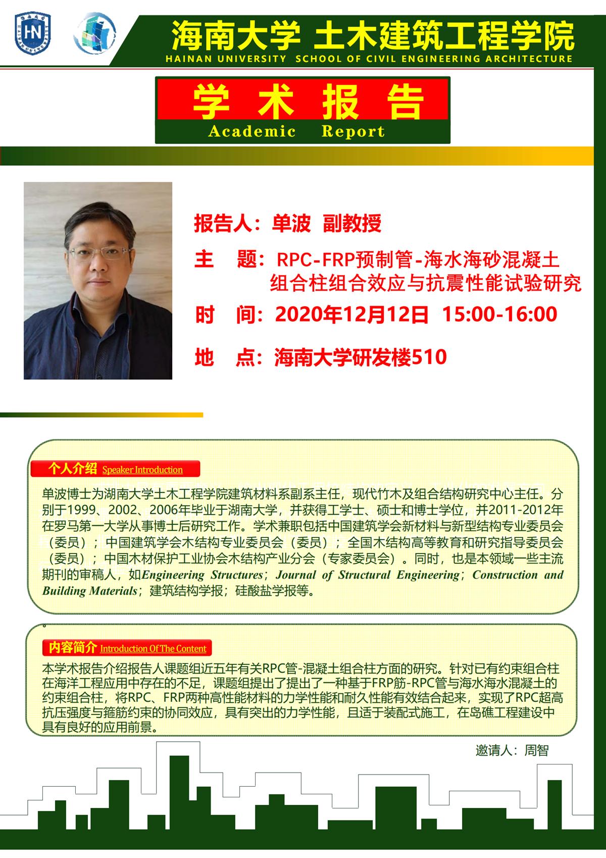 12月12日下午3点,研发楼510举行术报告会,主题《RPC-FRP预制管-海水海砂混凝土组合柱组合效应与抗震性能试验研究》,欢迎公司各位老师参加。报告人:湖南大学单波副教授。