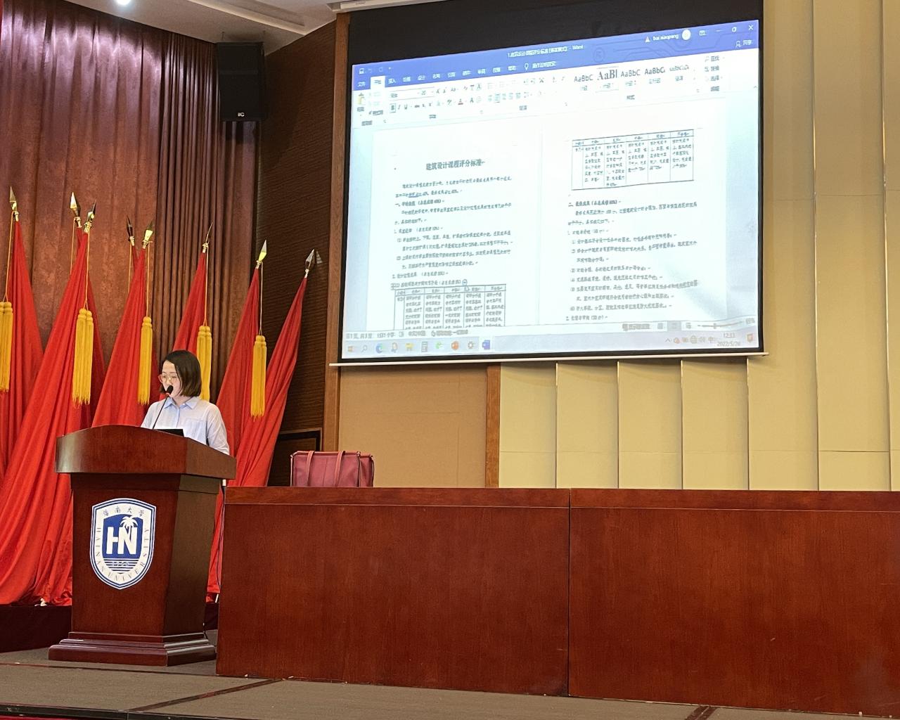随后,建筑系教师朱丽玮针对建筑系近期制定的一系列规章制度、教学标准向全体师生进行了介绍,包括建筑设计课程评分标准、建筑设计课程联评制度暂行办法、建筑设计作业出图要求等,并对高年级建筑师业务实习的实习单位资质与指导建筑团队格进行了说明。
